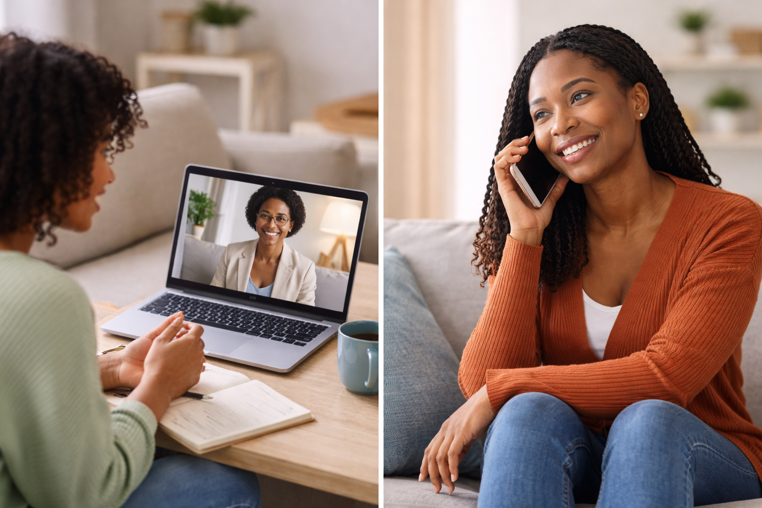 Your telehealth session is a secure, confidential space to explore your thoughts and feelings with your licensed therapist. Whether by video or phone, you’ll discuss your goals, identify challenges, and begin developing strategies to support your mental health all from the comfort of your home. Sessions are collaborative, supportive, and tailored to your needs.